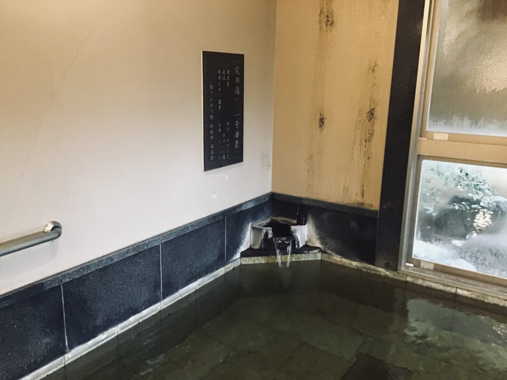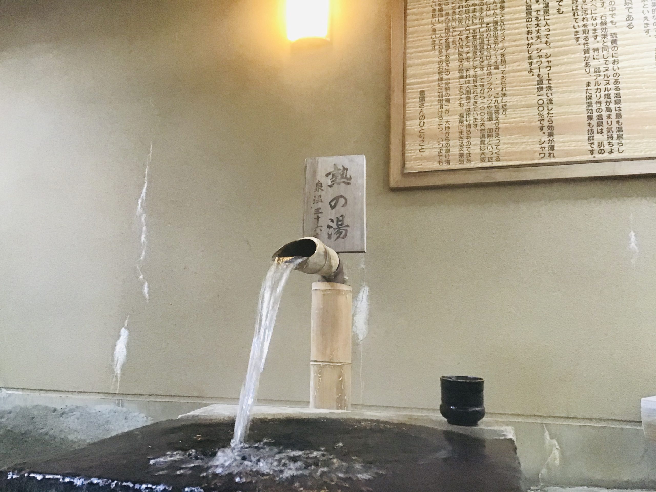 「完の湯」と「熟の湯」が浴場に注がれています。もちろん飲泉も出来ます。カルシウムやナトリウムが多く含まれているとの事、飲む野菜なのだそうです。飲泉効果としては、胃腸病、糖尿病、痛風、便秘、肥満、二日酔いに効果があるそうです。