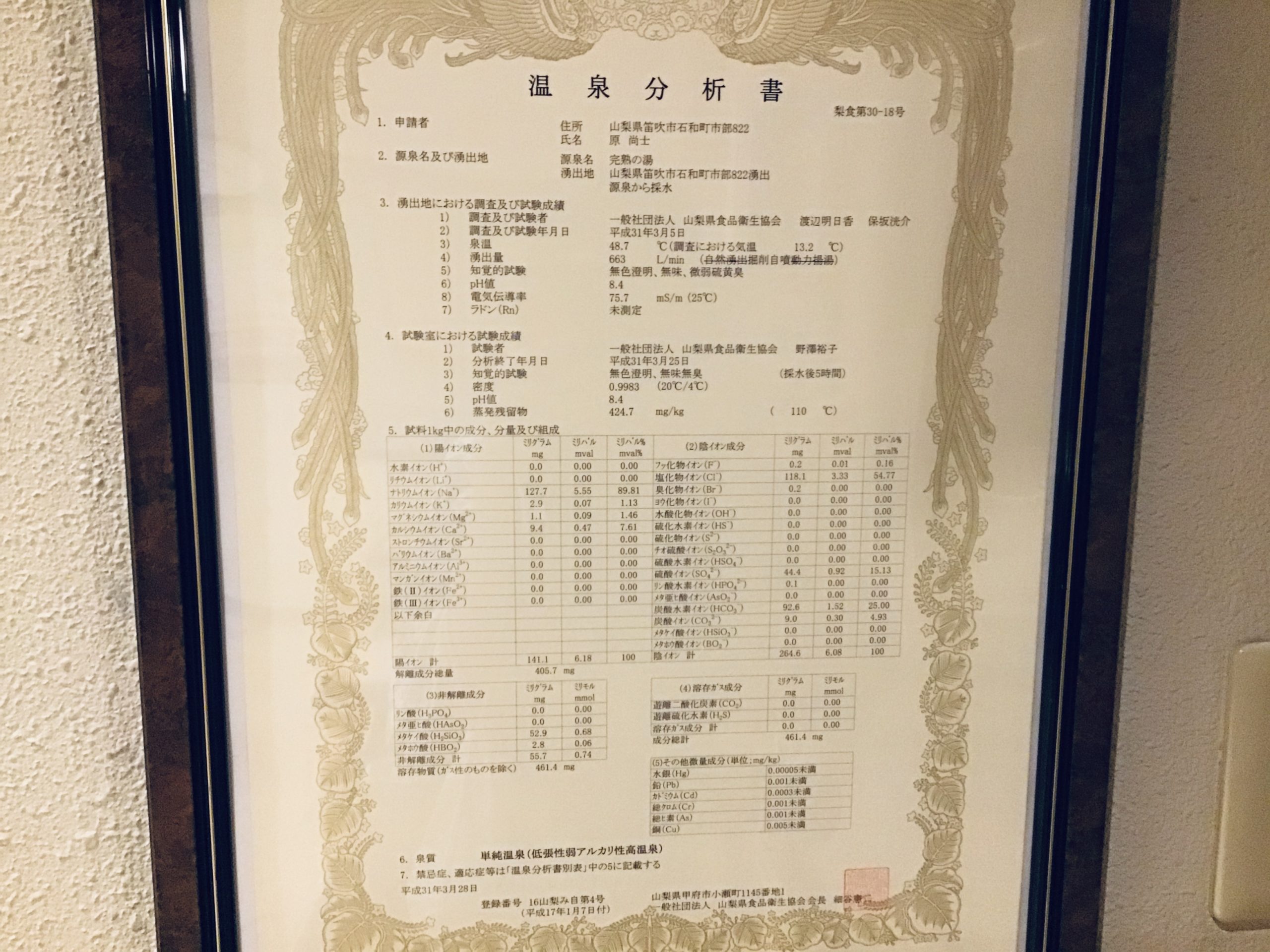 こちらが温泉分析書です。3箇所全ての温泉が加水、加温、循環、消毒のない正真正銘の源泉100%の温泉です。
