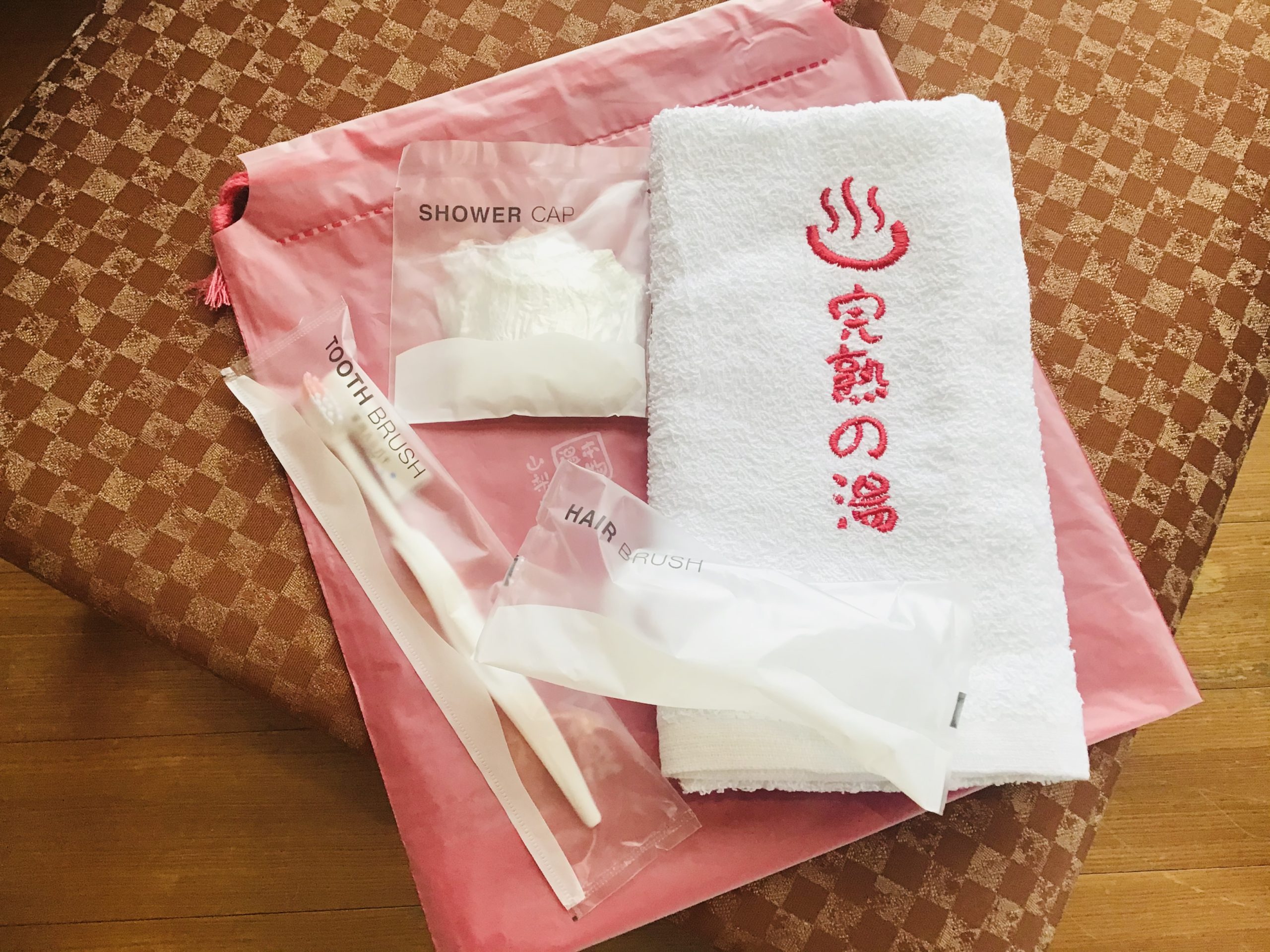 浴衣と羽織りとタビックス。バスタオル。宿の名が入った袋には、フェイスタオルと歯ブラシ、シャワーキャップ、ヘアブラシが入っています(女性バージョンかと思います)。フェイスタオルには「完熟の湯」と刺繍がされています。刺繍って珍しいですね!
