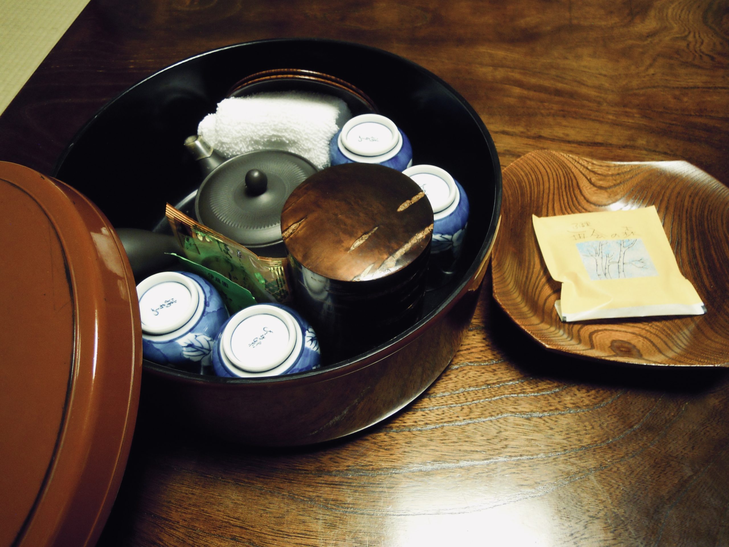 お茶セットとサービスのお茶菓子です。こちらのお菓子は大仙市にある正貢堂という洋菓子店のクッキーで、宿の売店でも販売されていました。