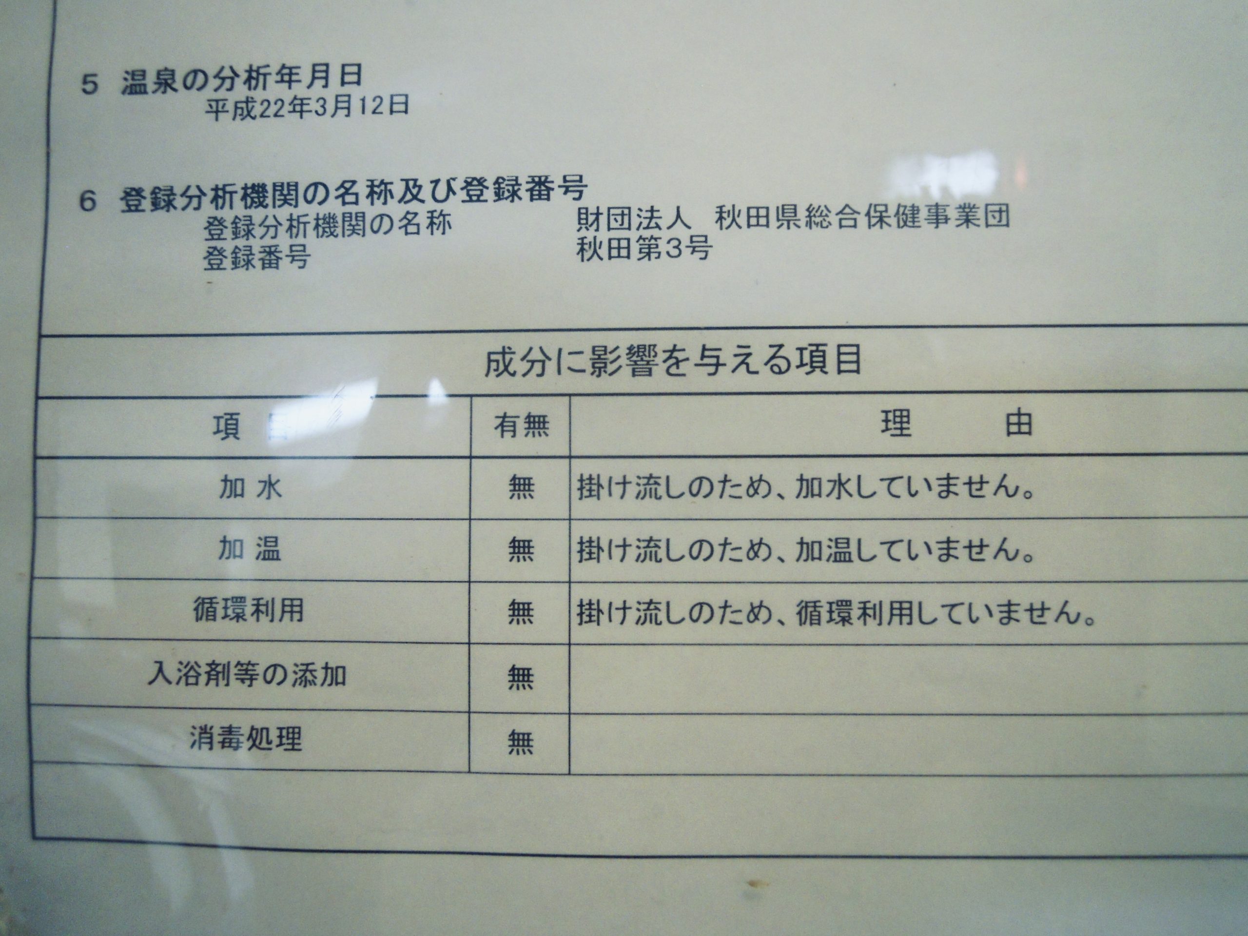 洗面所前には、温泉分析書が掲示してあります。加水、加温、循環、一切ありません。入浴剤、消毒剤も使用していません。