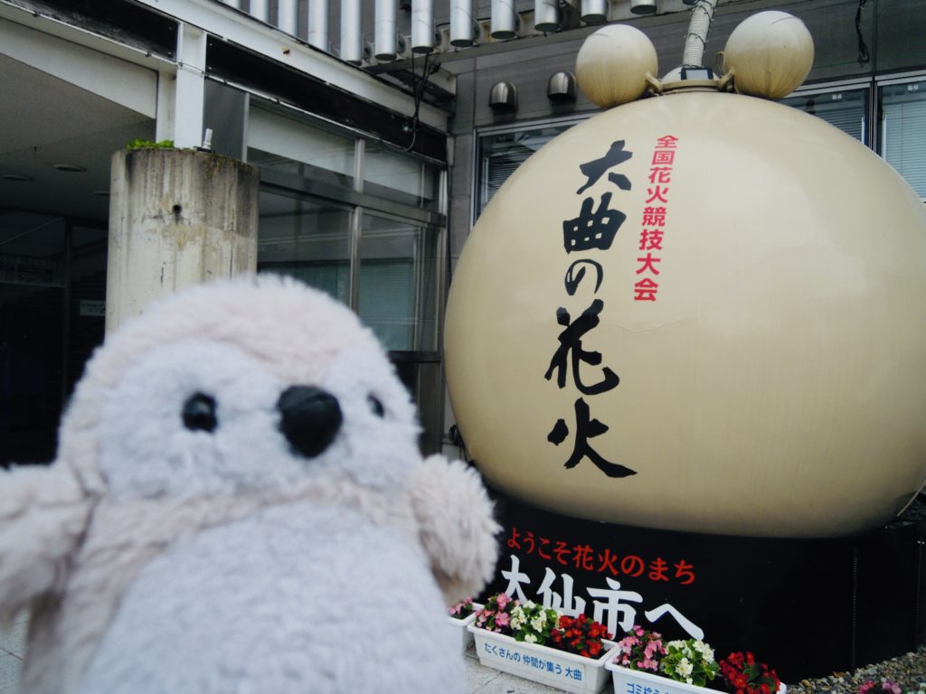 大曲駅構内には観光案内所もあり、秋田の名産品が取り揃う土産物屋も併設されています。西口駅前には巨大な花火玉が置かれています。大曲といえば、毎年8月に行われる「全国花火競技大会」が有名です。