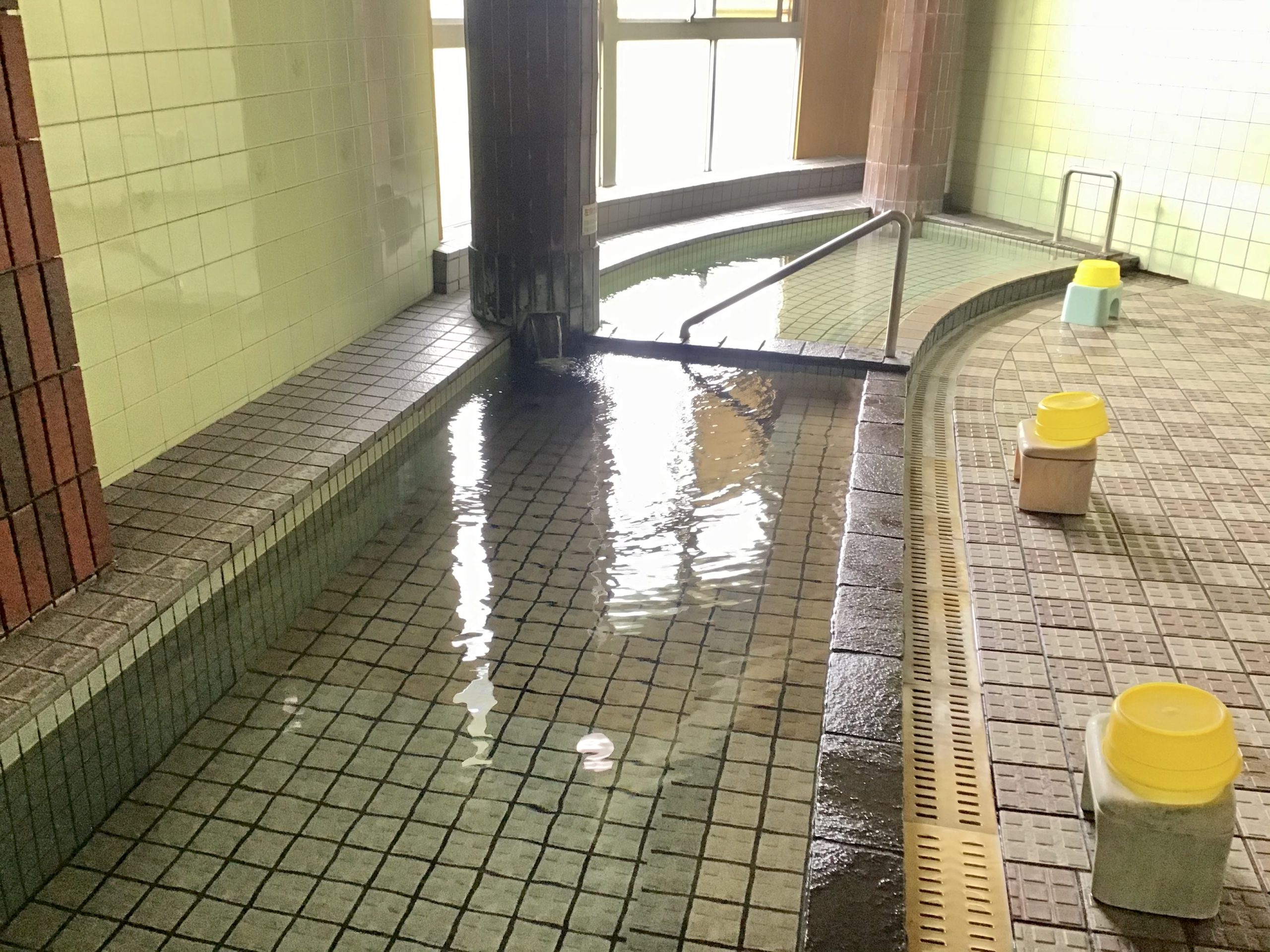 浴槽は2つに分かれています。向かって左側が温かく、右側は加温されていない温泉です。海のホテル一の滝さんの源泉は2本あり、源泉温度が37.8℃と35.8℃とぬるめですので、2つに分かれた内1つの浴槽は加温されています。ちなみにぬるい方から入浴すると良いそうです。